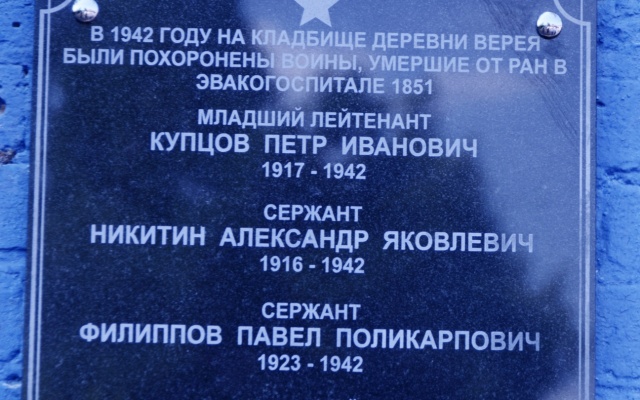 В 1942 г. на территории с.п.Верейское действовал госпиталь. В нем, как и во многих других, от ран умирали те, кто шел на смертный бой, защищая свою Родину. Так, в 2013 г. Илья выяснил, что на территории старого Верейского кладбища находились воинские захоронения. На сегодняшний день удалось найти только одну могилу, за которой ухаживают родственники погибшего солдата. Остальных, увы, нет. Но это не значит, что люди должны уйти в вечность без памяти. Младший лейтенант Петр Иванович Купцов, сержант Павел Поликарпович Филиппов, рядовые Алексей Александрович Жуков, Иван Ефимович Злобин, Василий Кузьмич Шваб, Александр Иванович Юпиков скончались в эвакуационном госпитале в 1942 г. Самому младшему из них было всего 19 лет, самому старшему - 46… Теперь у входа в сельское кладбище висит доска, где увековечены имена смелых, сильных духом, мужественных людей, не доживших до нынешних дней, но защищавших страну-победительницу.