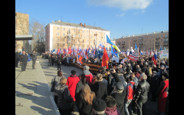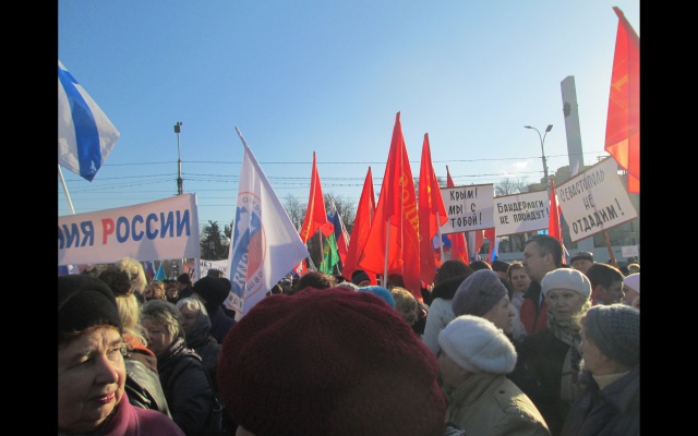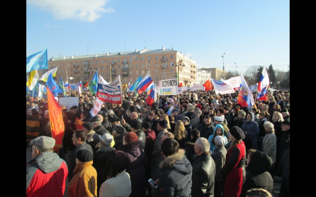 В четверг, 13 марта, на площади Победы в городе Рязани прошел митинг в поддержку жителей Крыма. Пожалуй, такое количество народа не собирается здесь даже на общегородские праздники. Люди абсолютно разных возрастов, разных политических взглядов, с семьями, с друзьями пришли на митинг.