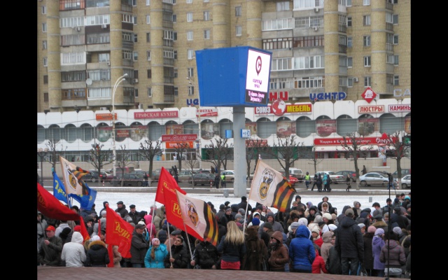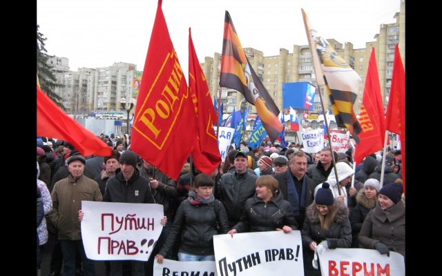 Родинцы подготовили лозунги-плакаты: "Крым – мы с тобой!", "Своих не бросаем", "Мы вместе!", "Крым — русская земля", "Чужого не надо, своего не отдадим", "Верим Путину!", "Путин прав!" , «Севастополь – город русских моряков!» и другие.